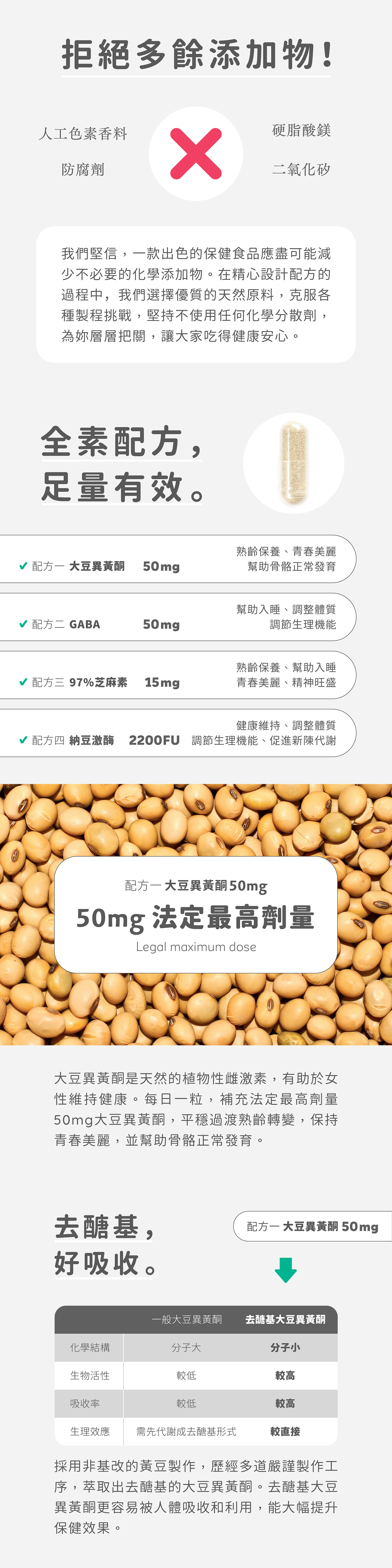 採用非基因改造的天然大豆,萃取去醣基大豆異黃酮,大幅提升吸收率;有助女性維持健康,是一種天然「吃的化粧品」